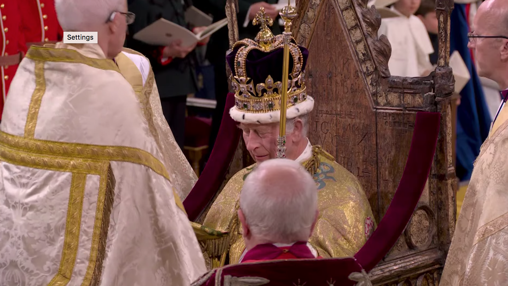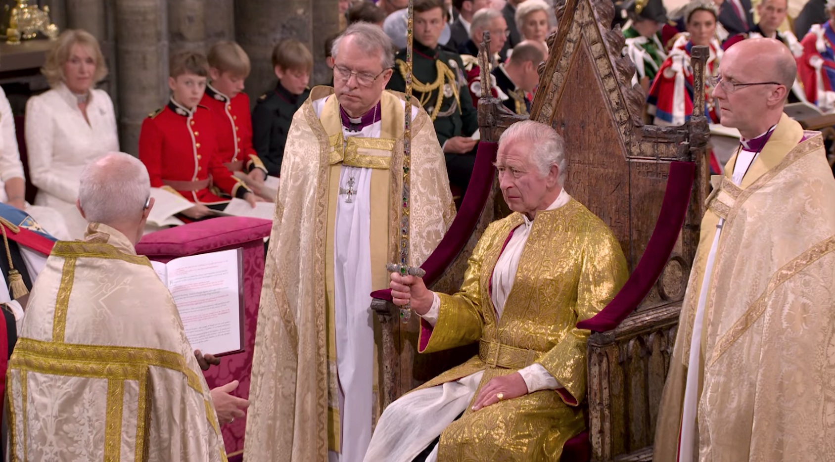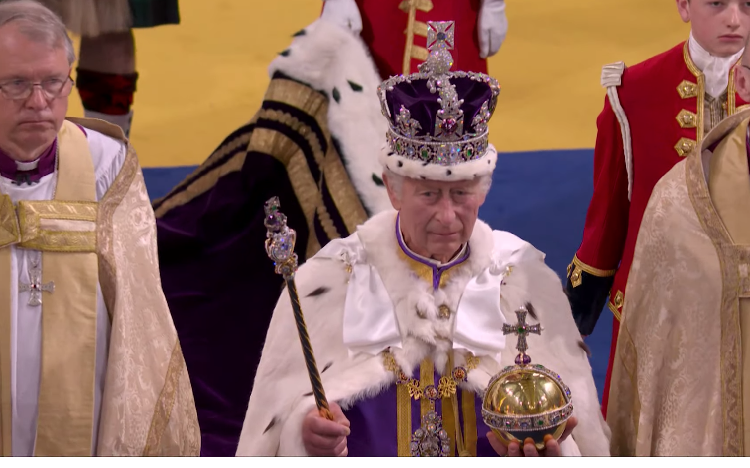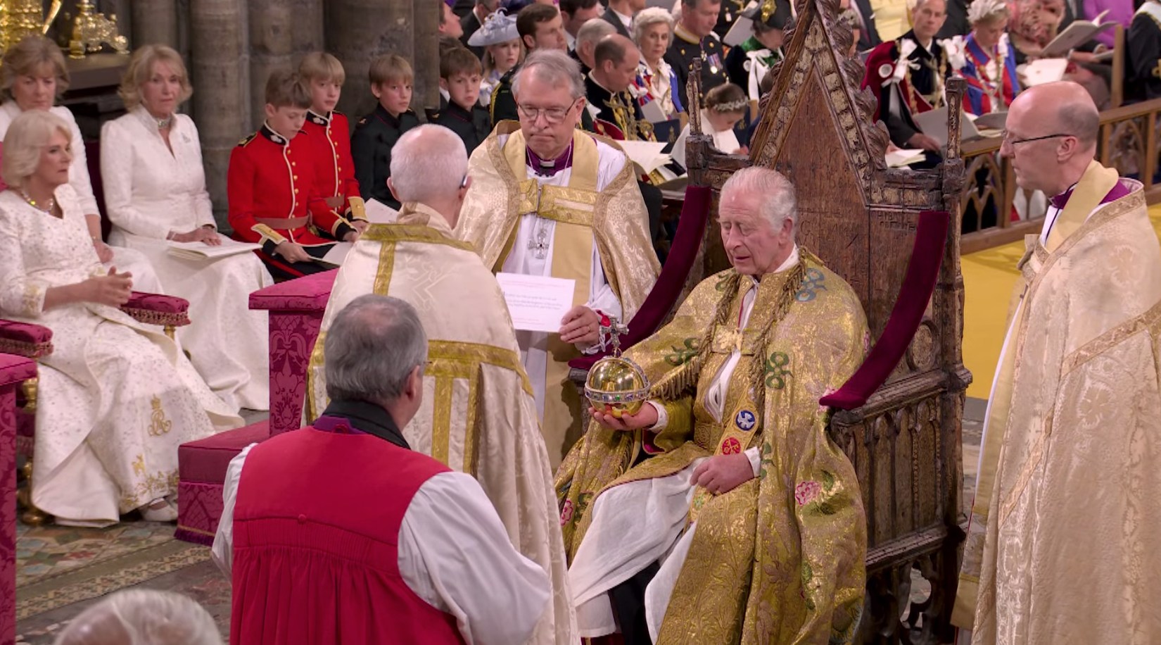 Su majestad portó la túnica de terciopelo carmesí de su abuelo Jorge VI, y prestó juramento y fue ungido con aceite sagrado antes de que le colocaran la corona de San Eduardo en la cabeza. Camilla, la reina consorte, fue coronada con la corona de la reina María.