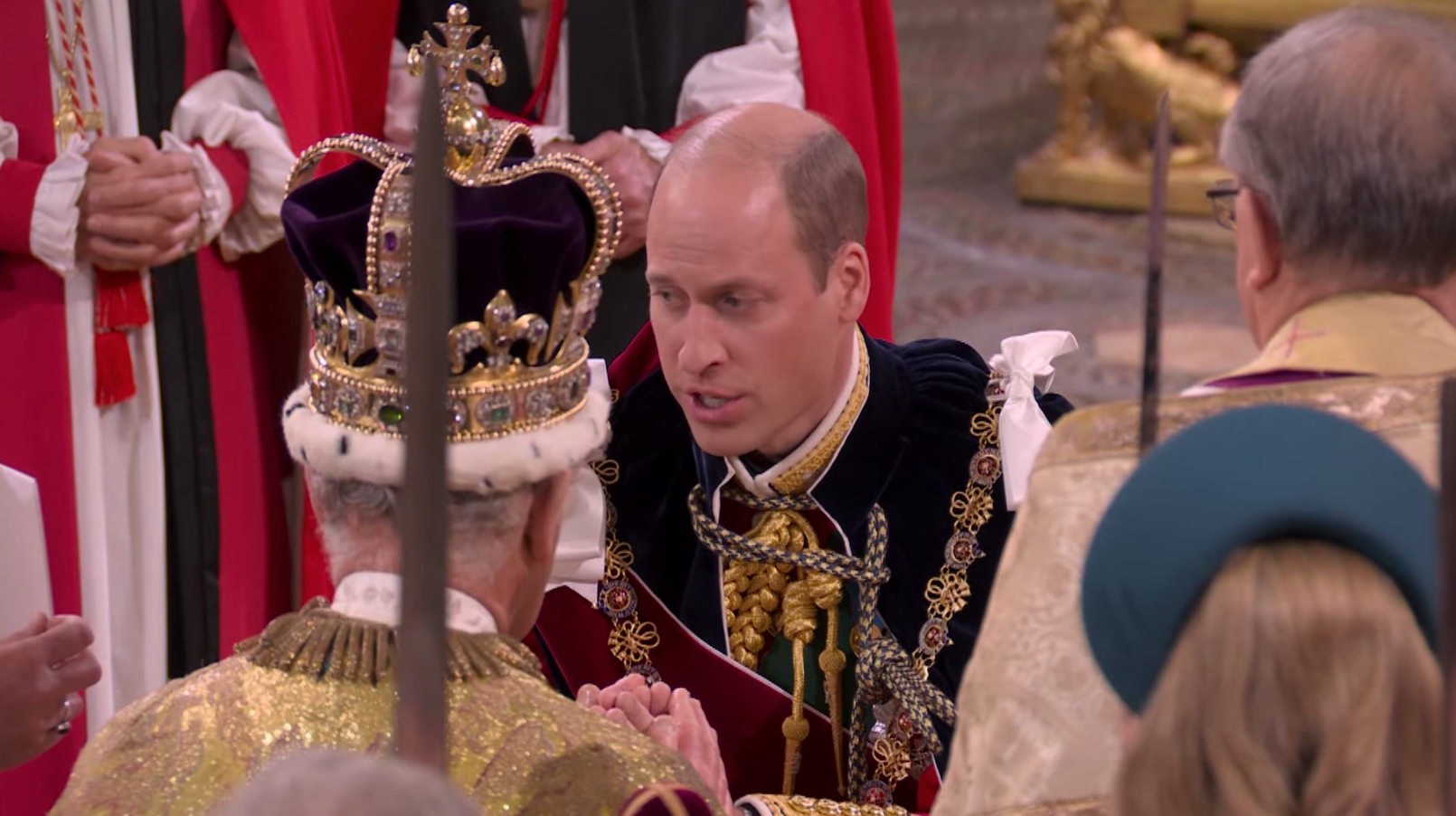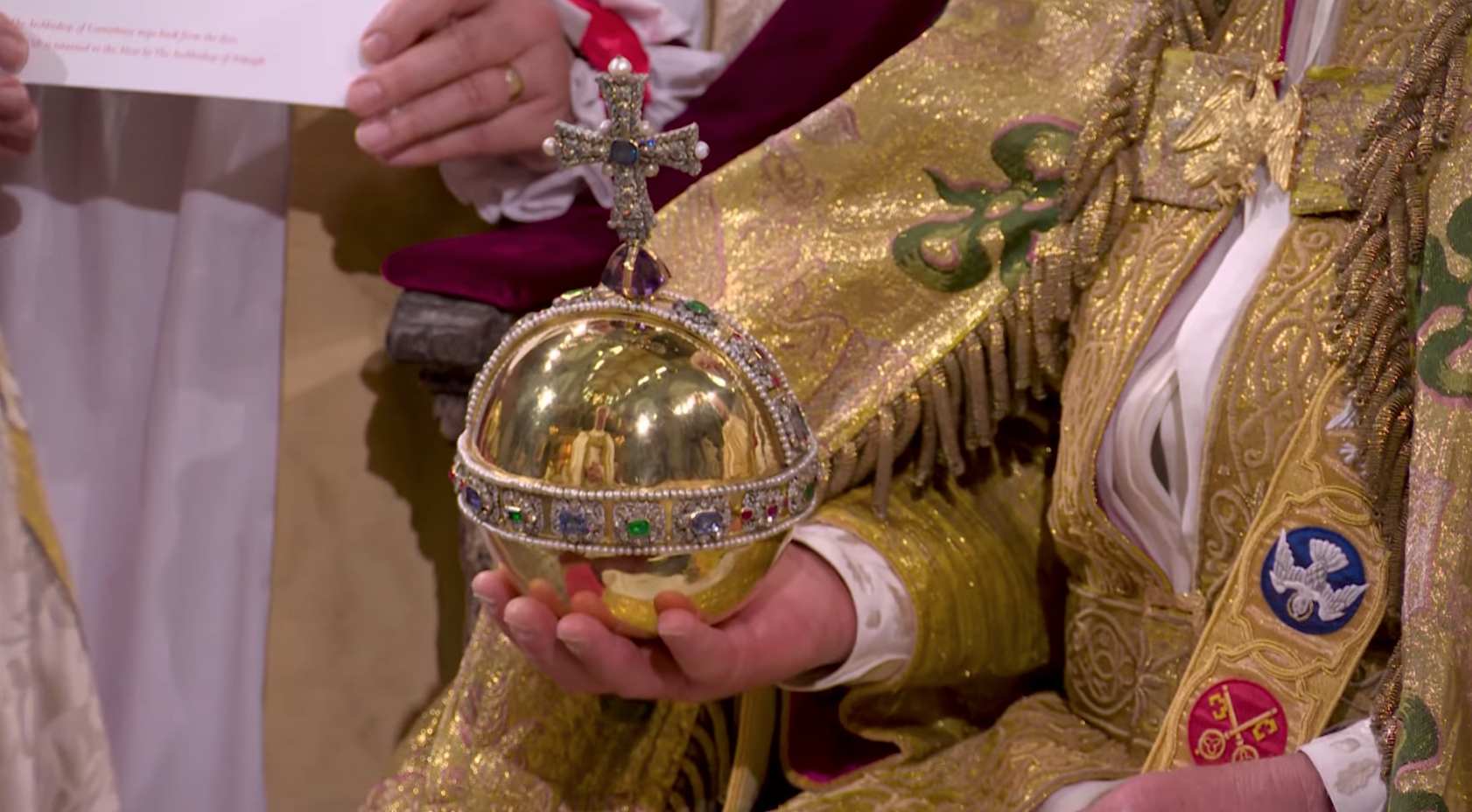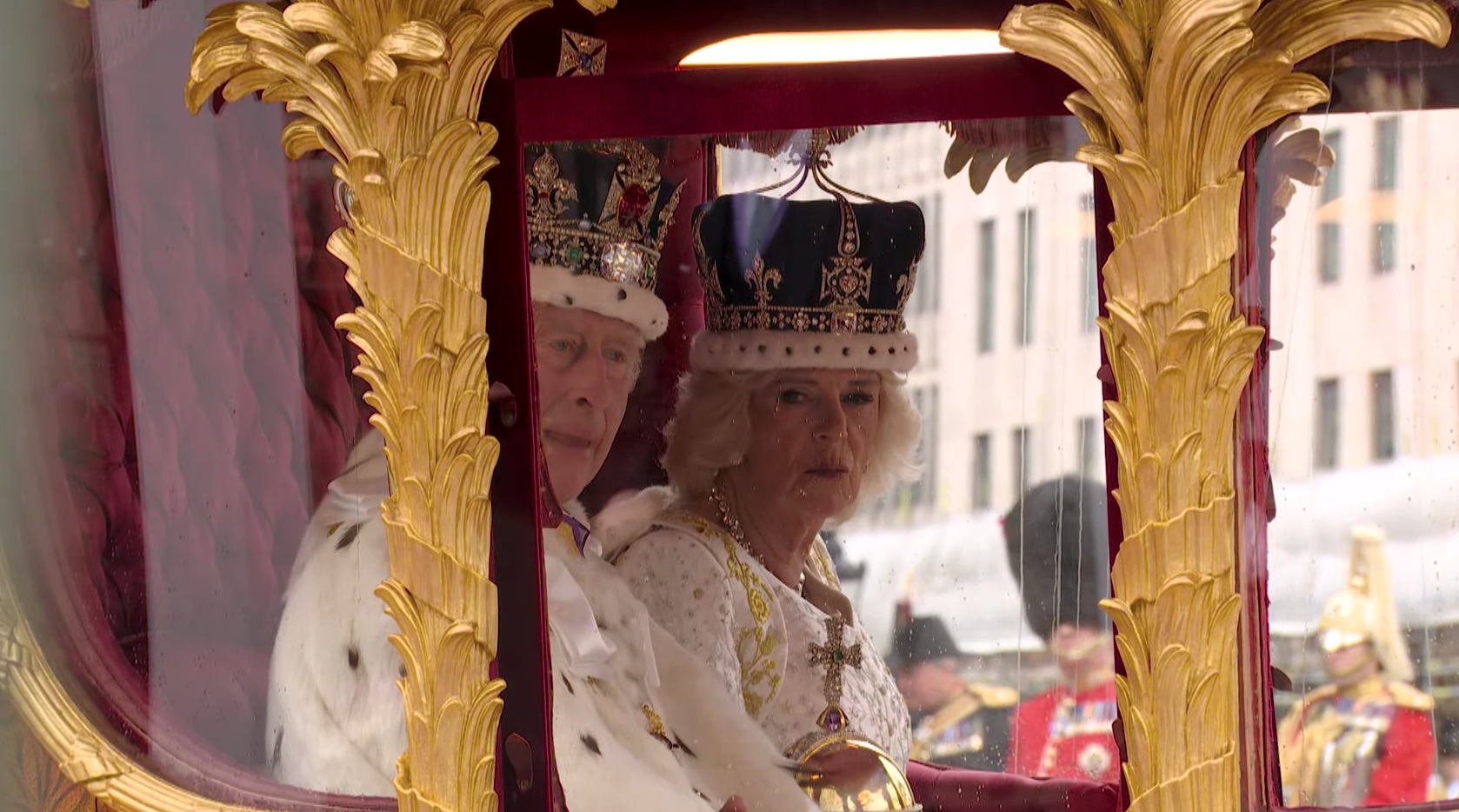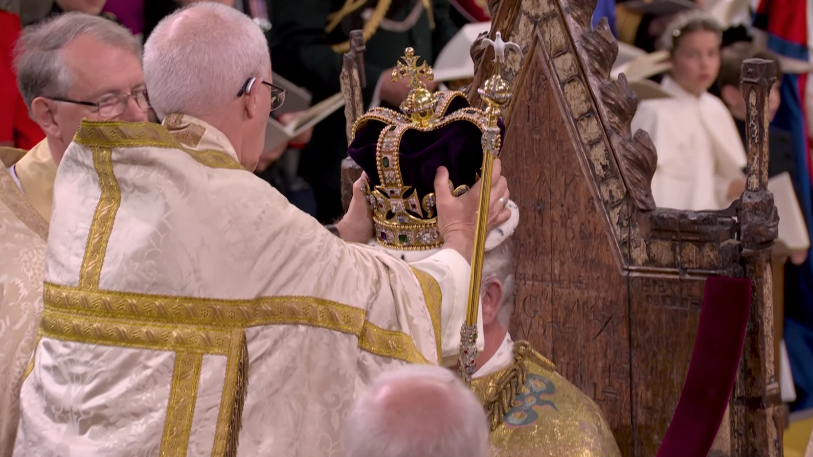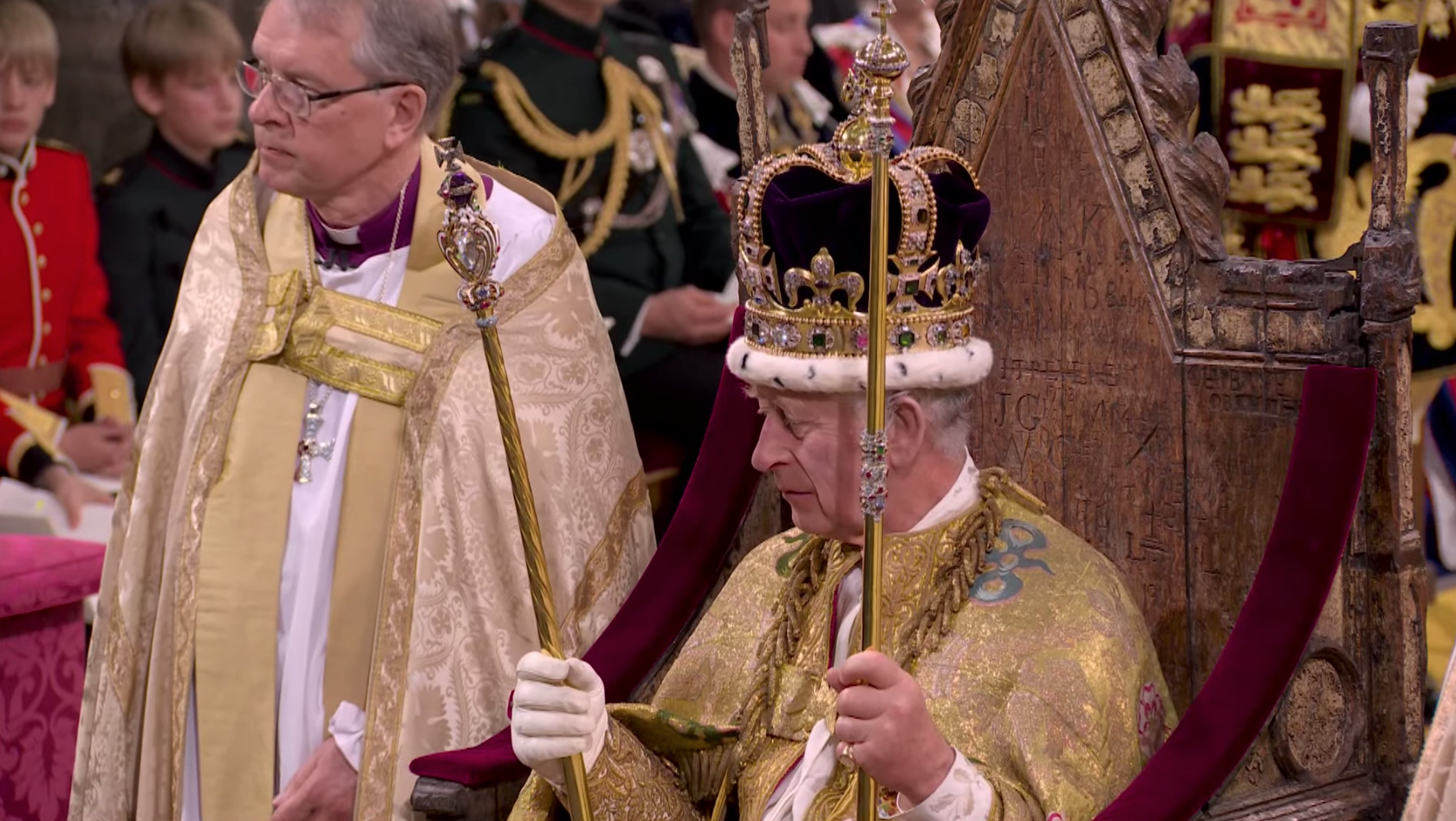 Su majestad portó la túnica de terciopelo carmesí de su abuelo Jorge VI, y prestó juramento y fue ungido con aceite sagrado antes de que le colocaran la corona de San Eduardo en la cabeza. Camilla, la reina consorte, fue coronada con la corona de la reina María.