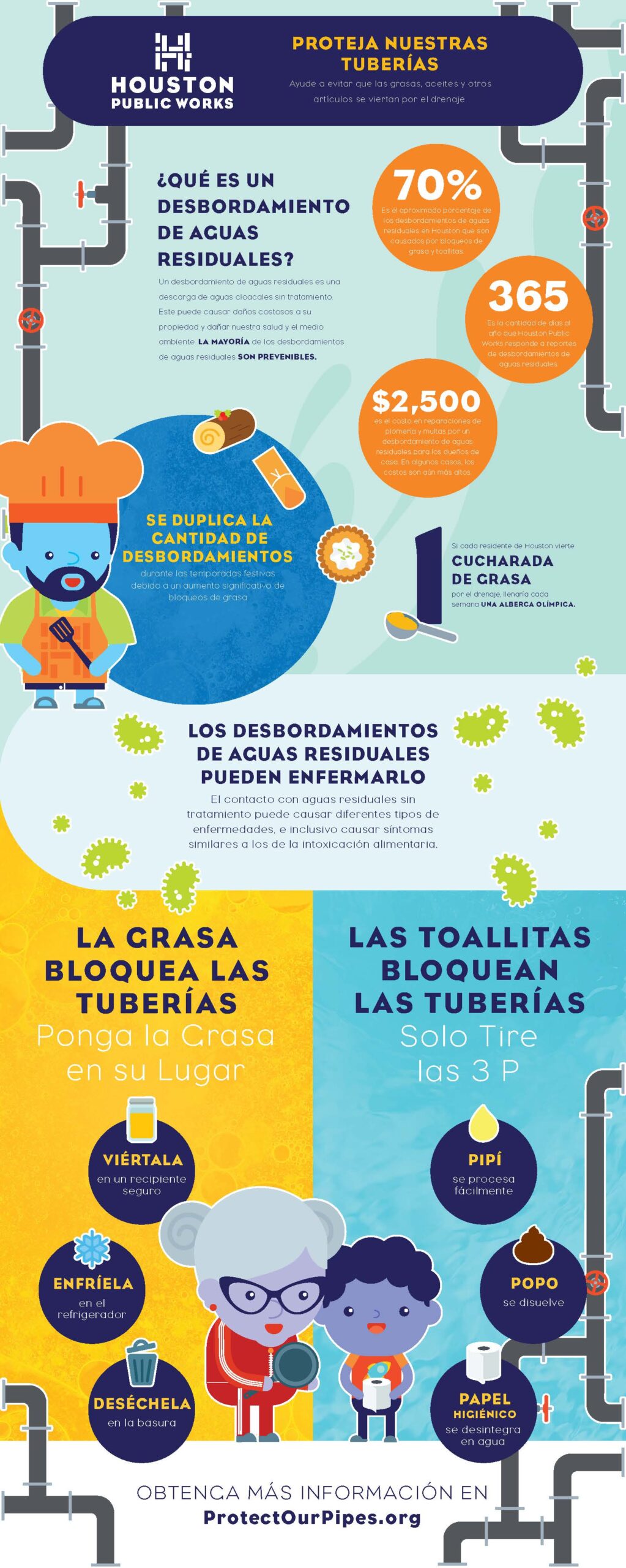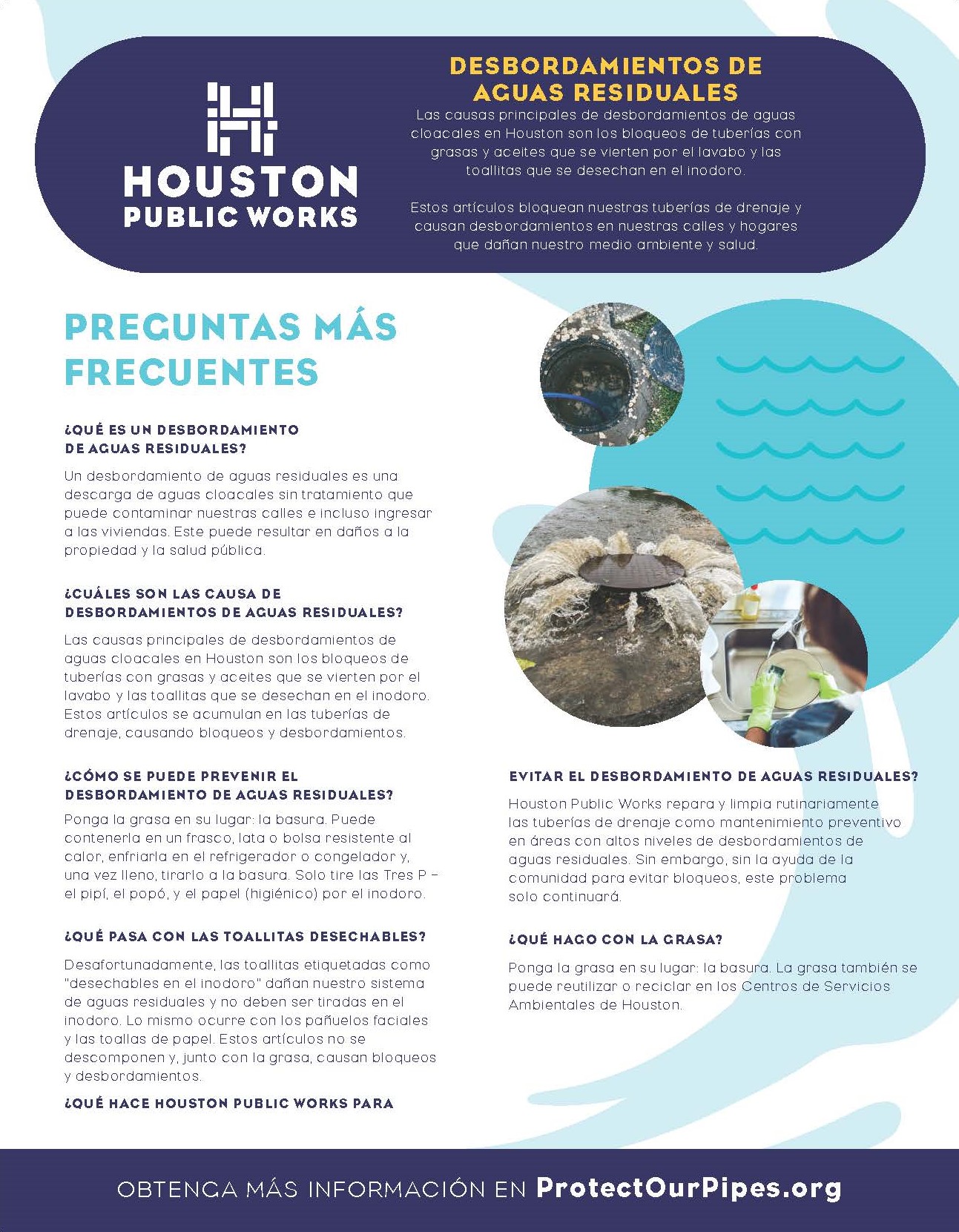 Se estima que 70% de los desbordamientos de aguas residuals en Houston son causados por obstrucciones causadas por grasa y toallitas. Estos desbordamientos casi se duplican durante los meses de vacaciones.