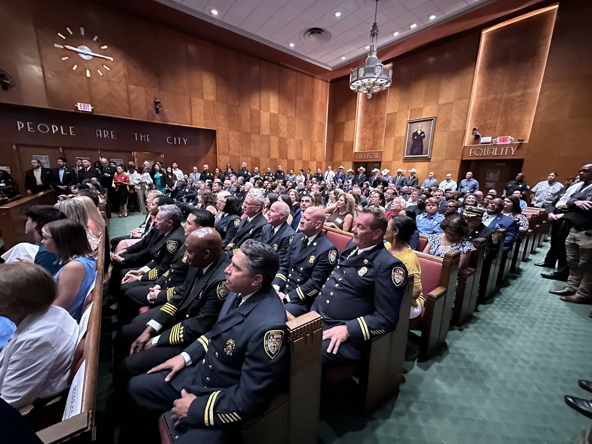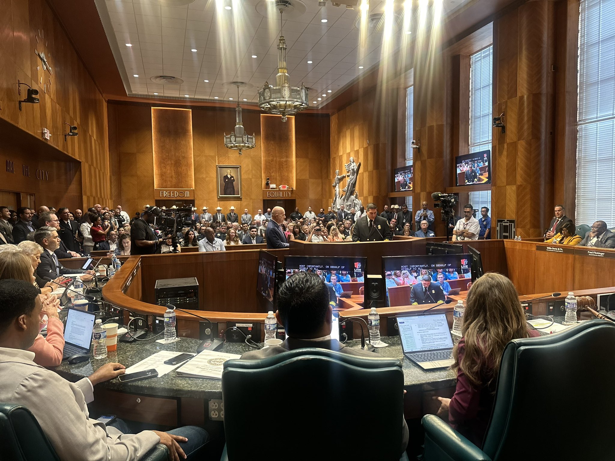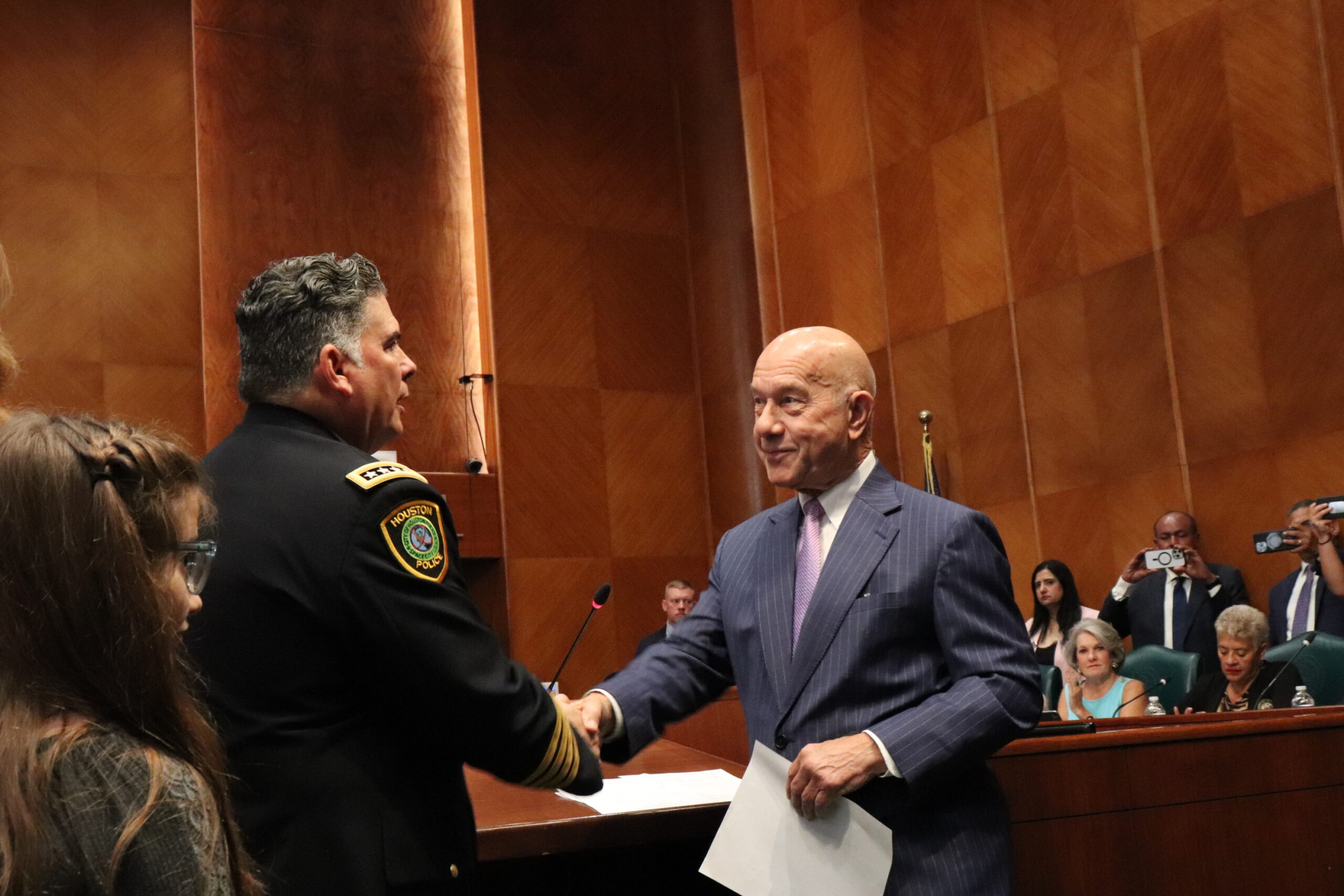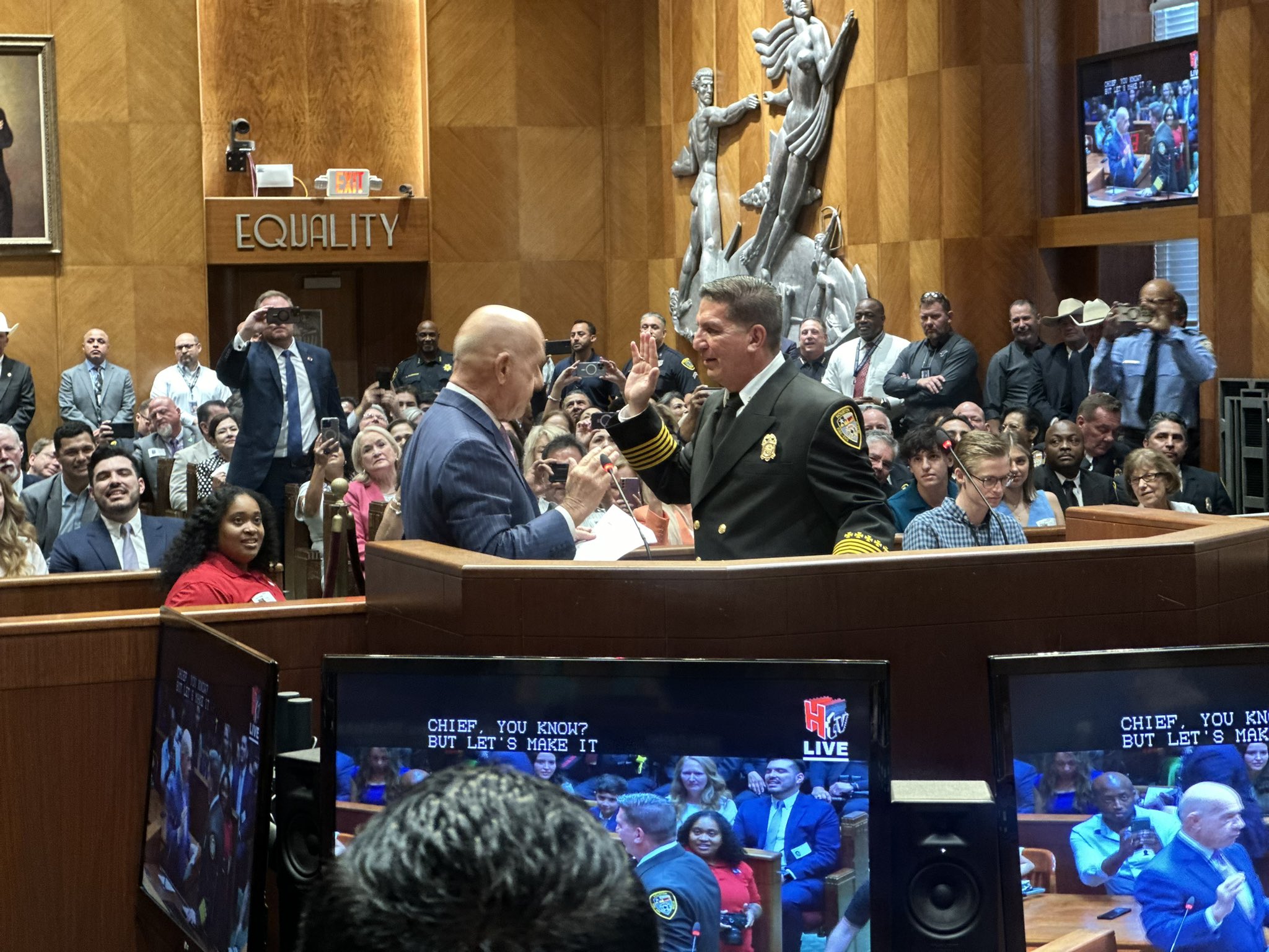 Después de la votación, el alcalde John Whitmire orgullosamente ofició la juramentación de Noe Díaz como el nuevo jefe del Departamento de Policía de Houston y  Thomas Muñoz como el nuevo jefe del Departamento de Bomberos
